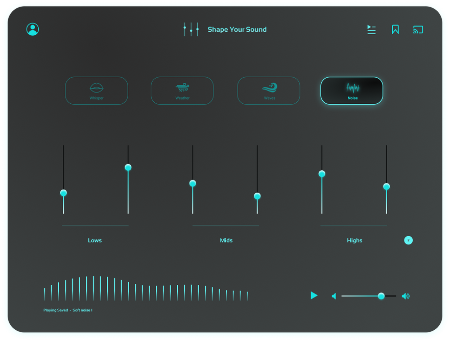 ASMR is something many people today use to relax and often times in the evening. With that in mind, I went with a dark interface and a bright greenish-blue for the components keeping it simple and easy to look at in the dark. One difference from the wireframe is now having a visual representation of the sound wave which would be cool to look at when developed.